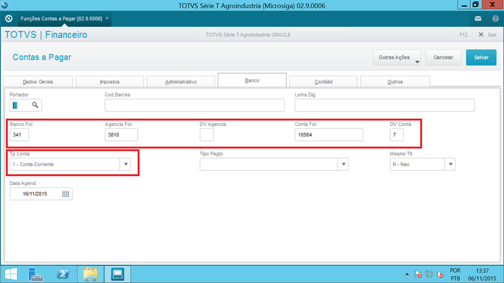 TP.CTA.FOR: informe o tipo de conta, Corrente ou Poupança.