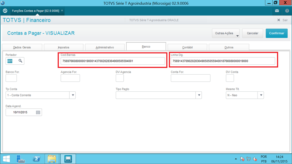 Durante o preenchimento da Linha Digitável, o campo Código de Barras será preenchido automaticamente.