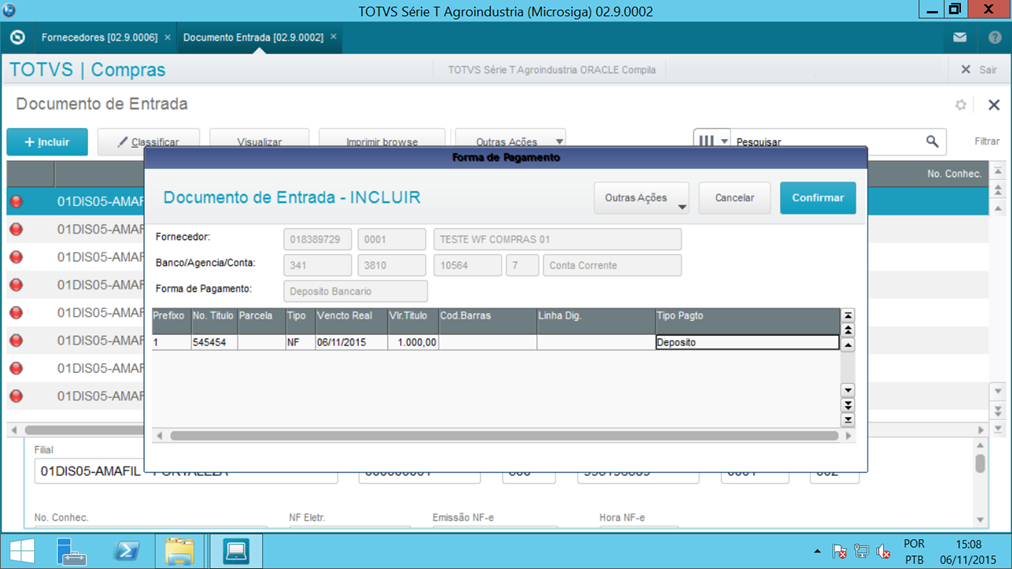 A automação permite que no final do processo de gravação da nota, seja solicitada a confirmação dos dados de pagamento e dependendo da forma de pagamento (informado no cadastro do fornecedor), implementar as informações básicas nos títulos, onde: