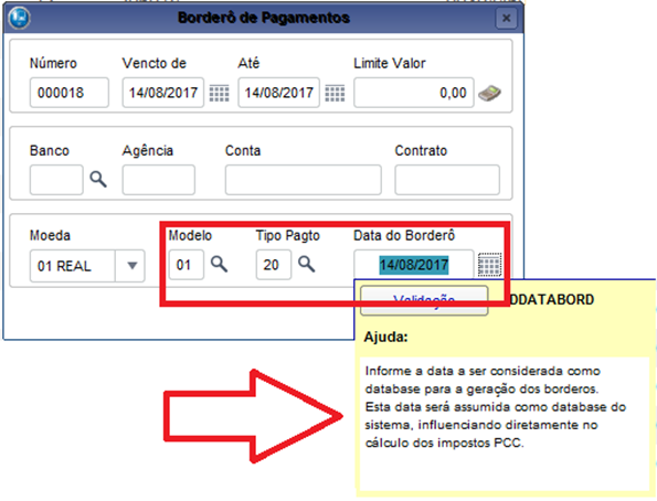 | MV_X003B03 | Caracter | Data para pagamento efetivo do Titulo. 1=Data do Vencimento Real (E2_VENCREA) 2=Data da Emissão do Borderô (EA_DATABOR) 3=Data da geração do Arquivo (DDATABASE) |