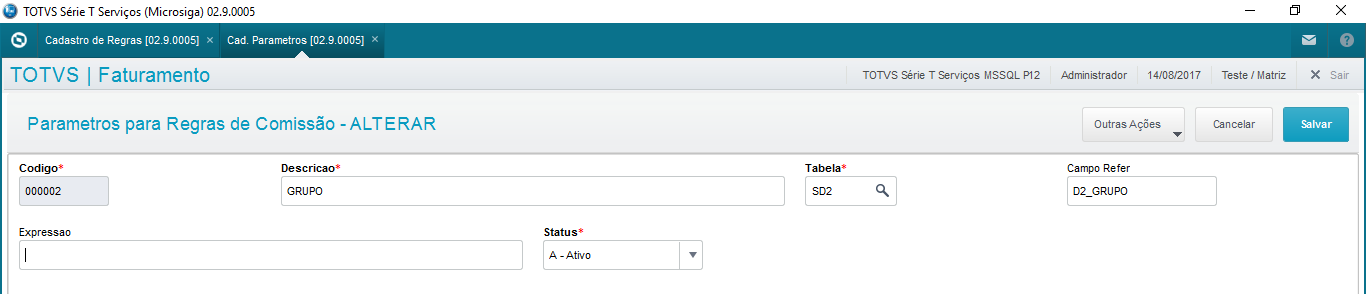 Neste cadastro são definidos os parâmetros que posteriormente serão utilizados para compor as regras de comissionamento.