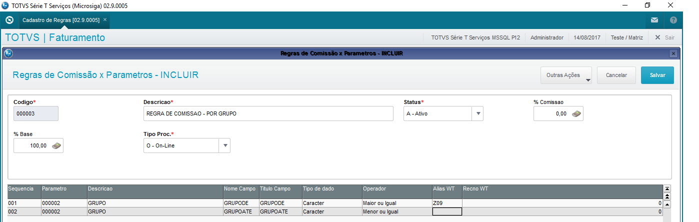 Neste exemplo, se o produto vendido pertencer ao grupo “AAAA” ou seja, não está na regra, o % de comissão a ser aplicado será o do cabeçalho da Regra.