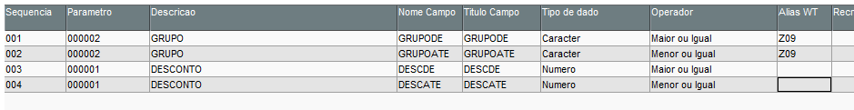| Grupo Produtos | Caracter | Grupo até | Menor ou igual |
