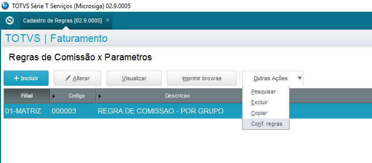 Esta opção encontra-se dentro do cadastro de Regras, em Outras Ações / Conf. Regras.