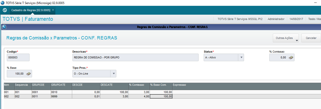 - % Comissão Na hipótese de nenhum dos itens da regra ser atendido, será utilizado o percentual de Comissão informado no cabeçalho da regra.