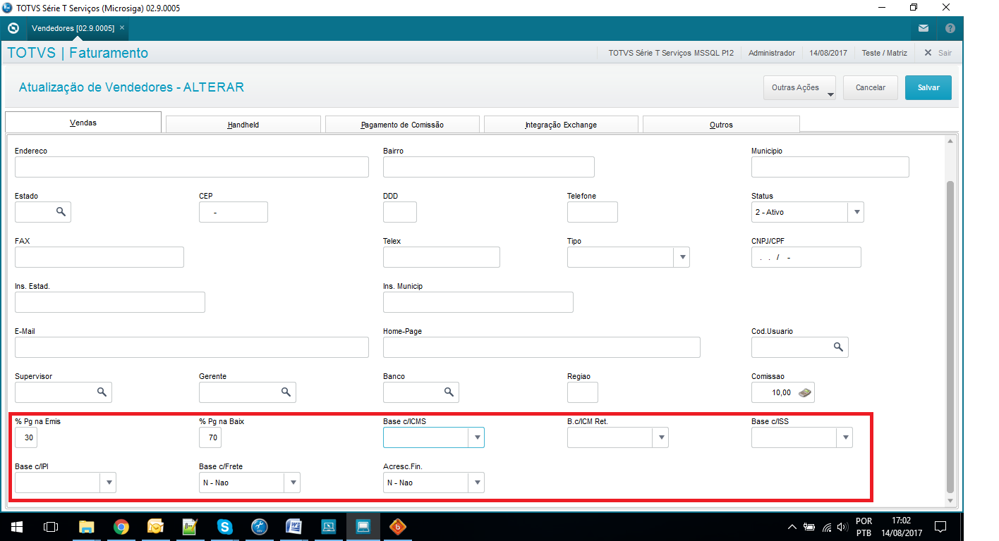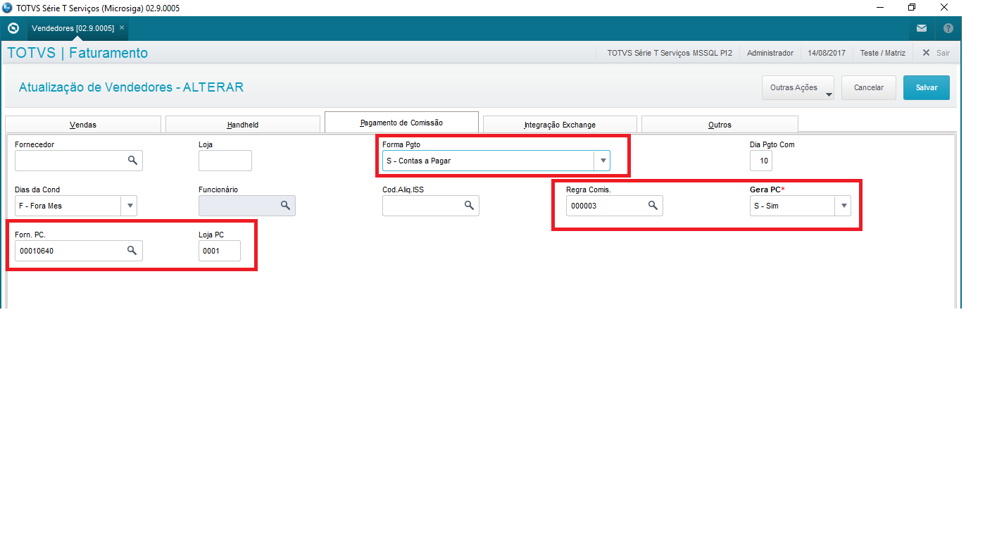 Importante: O cálculo da comissão é gerado somente no momento do Faturamento da Nota Fiscal de Saída, ou seja, no Pedido de Vendas ainda não é possível saber qual será o % de comissão aplicado.