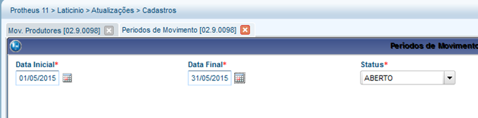 Pré-requisito: Deve ser cadastrado Períodos de Movimentos para poder cadastrar Movimento Produtor. Abaixo tela de cadastro: