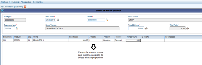 Quando coletado Leite, sistema já gera movimentação interna (Estoque) da entrada do leite. Quando coletado Soro, sistema não gera Entrada de Estoque / pois haverá recebimento de Nota Fiscal de Entrada – pois é recebido de Empresas e não de produtores.