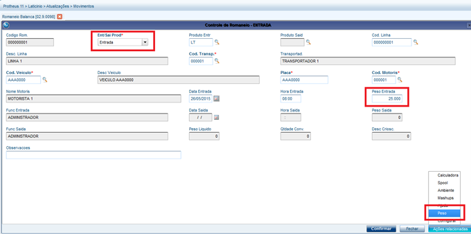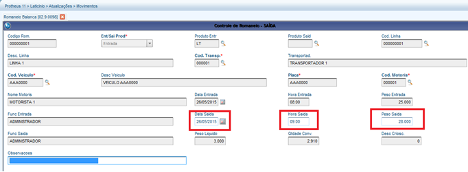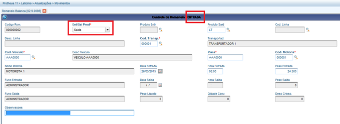 Exemplo movimento de Saida com pesagem referente a entrada anterior:
