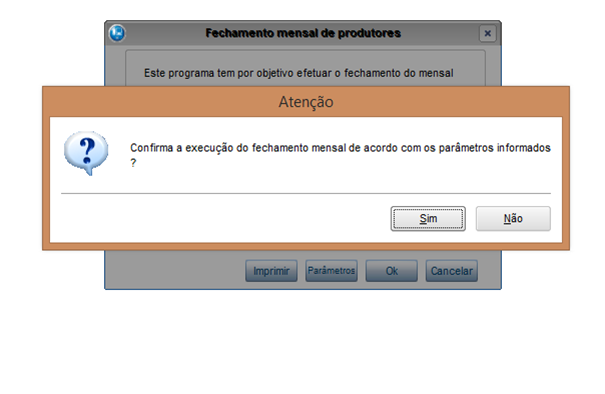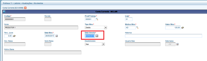 - Os parâmetros de data devem ser sempre referentes ao mês sequente do mês de movimento – pois todos os movimentos de Conta Corrente devem ser movimentados com VENCIMENTO no mês seguinte – assim como o financeiro do Fechamento Produtor é gerado para o mês seguinte dos movimentos.